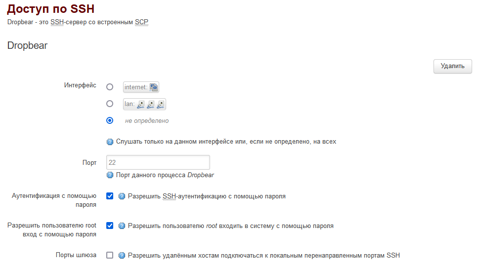 Если интерфейс стоит в режиме не определено, тогда разрешено подключение по SSH к контроллеру по любому интерфейсу, в том числе по GPRS. Не стоит отключать SSH совсем, но лучше перевести подключение в режим lan, тогда подключение по SSH будет доступно только при прямом подключении к контроллеру через его порт Eth.