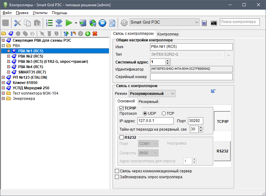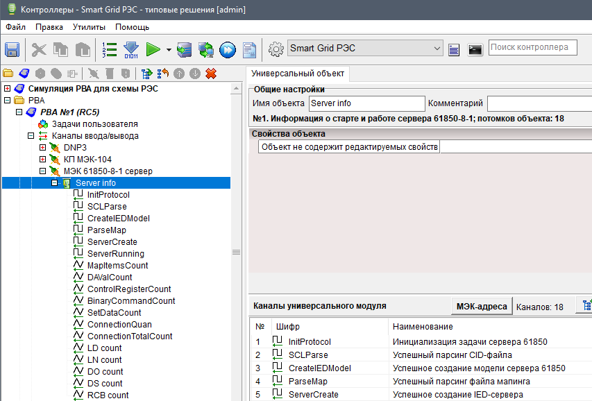 Используем модель сервера 61850 в конфигурации для контроллера. Для этого открываем типовой демонстрационный проект SmartGridRES из состава установленного дистрибутива SCADA ЭНТЕК, и запускаем модуль Контроллеры:
