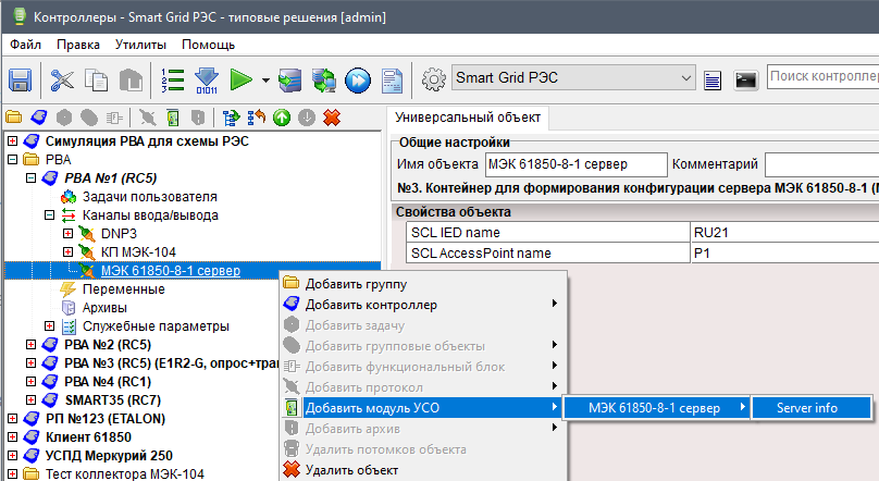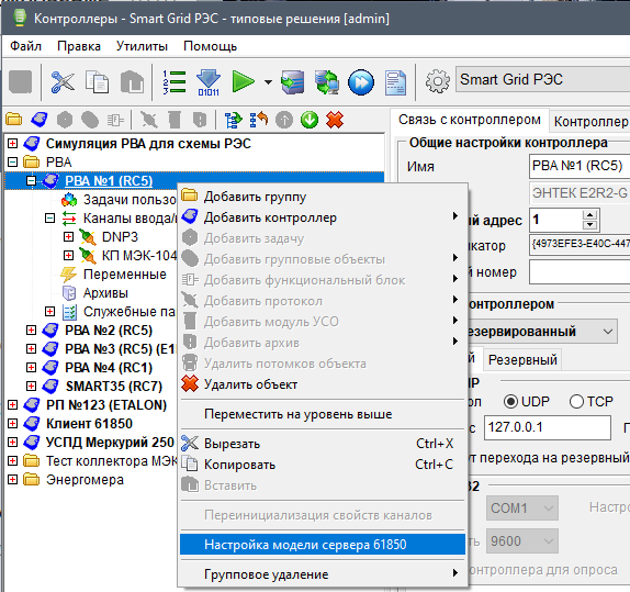 Будем настраивать передачу данных по протоколу МЭК 61850-8-1 для контроллера РВА №1 (RC5). Для этого кликаем правой кнопкой мыши на этом контроллере и выбираем пункт контекстного меню Настройка модели сервера 61850: