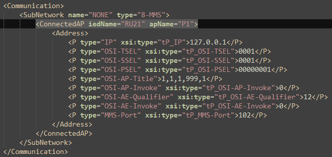 Далее надо задать правильные значения в полях SCL IED name и SCL AccessPoint name, которые берутся из файла SCL, вот фрагмент содержимого файла: