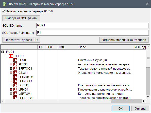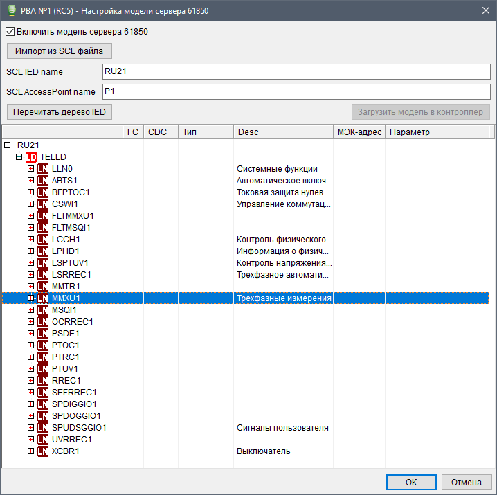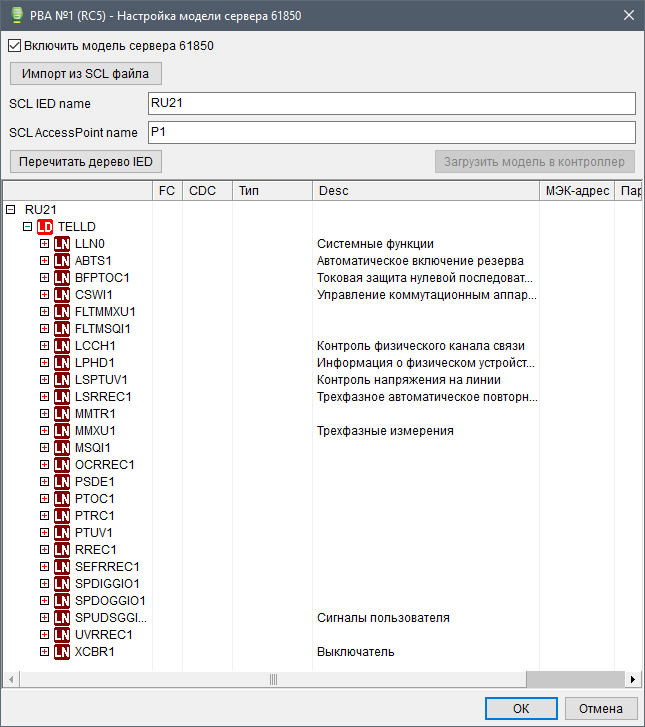 Видим что SCL-файл модели 61850 был успешно распарсен, в полученном дереве представлены те же логические узлы, что и в программе IEDScout. Нажимаем кнопку Ок, закрываем окно.