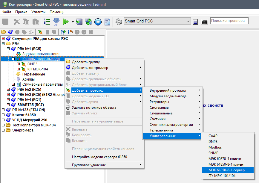 Добавляем в каналы ввода-вывода протокол МЭК 61850-8-1 сервер: