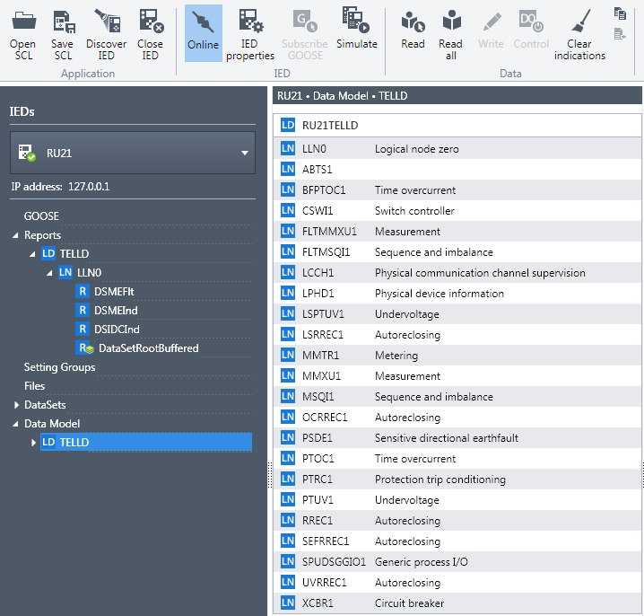 Как видим - IEDScout успешно подключился к серверу 61850 внутри контроллера, и прочитал из него информационную модель 61850.