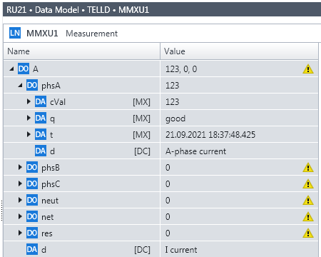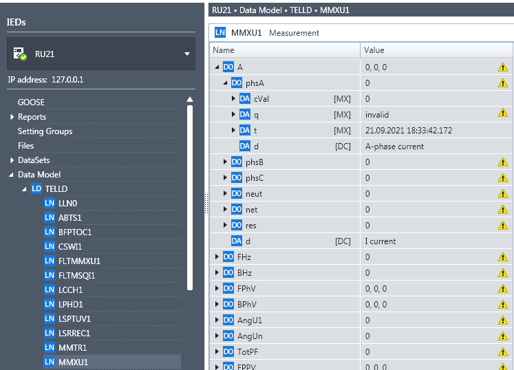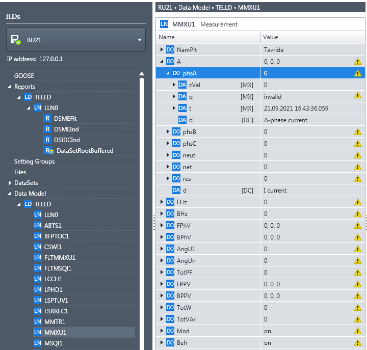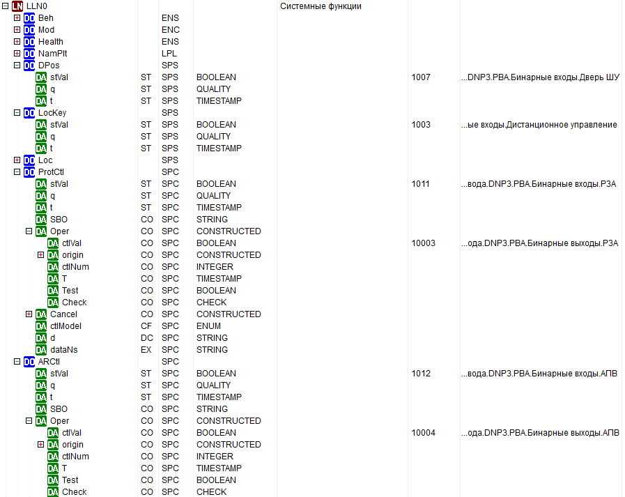 Видим, что все атрибуты данных внутри контроллера, кроме строковых описательных, находятся в недостоверном состоянии - это потому, что пока нами еще не была сделана настройка соответствия между элементами модели 61850 и параметрами из конфигурации ENLOGIC. Перейдем к этой процедуре.