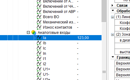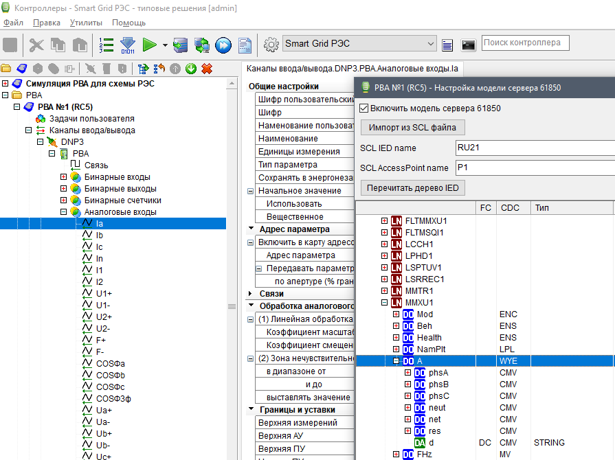 Окно настройки модели сервера 61850 не является модальным - то есть оно не блокирует доступ к нижележащему основному окну приложения. В этом окне необходимо раскрыть дерево тегов, найти нужны теги. Сейчас для привязки нам нужны теги из группы Аналоговые входы реклоузера в настройке опроса контроллера.
