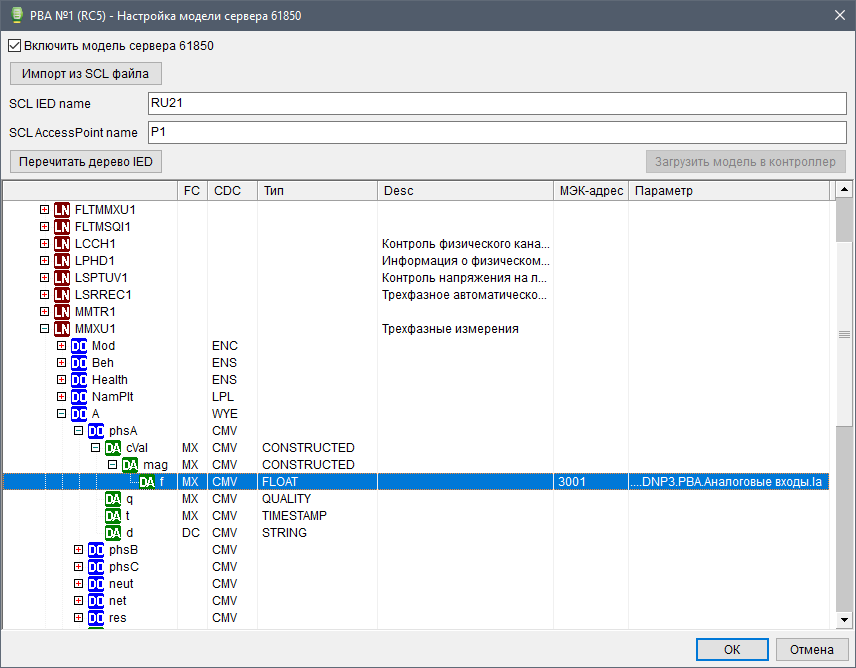 В окне показывается что появилась привязка параметра ENLOGIC с адресом 3001 к атрибуту объекта MMXU1.A.phsA.cVal.mag.f (значение параметра, эта привязка установилась в результате отпускания параметра Ia из дерева ENLOGIC на элементе phsA в дереве модели).