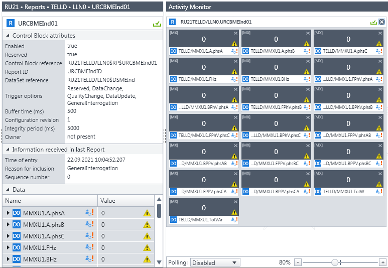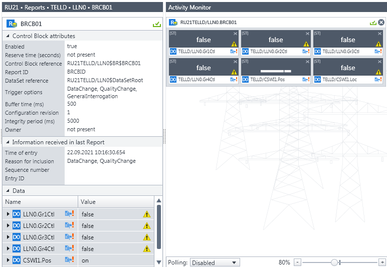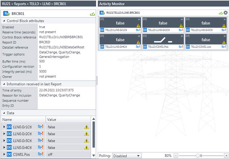 Видим что все значения имеют недостоверное значение - это происходит потому, что мы используем эмулятор, у которого нет реального подключения к блоку управления реклоузера.