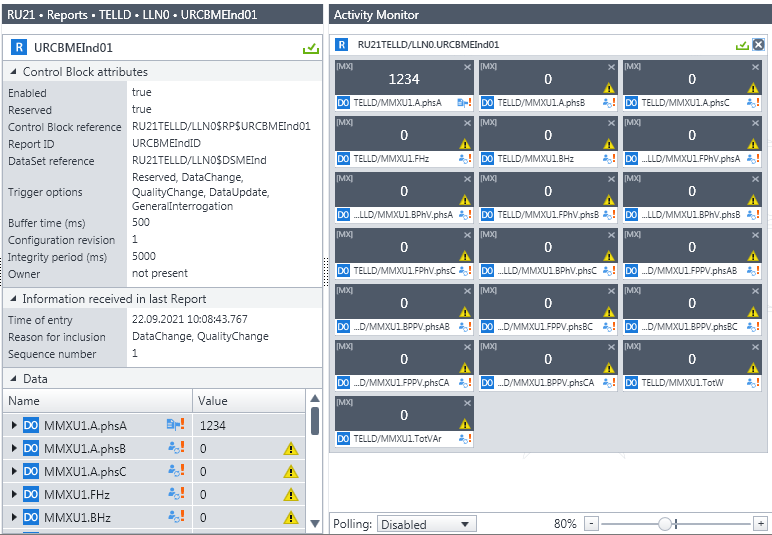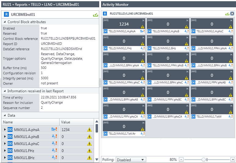 Меняем значение параметра Ia в контроллере вручную через ENLOGIC, и сразу видим получение одного отчета, который пришел по событиям DataChange и QualityChange: