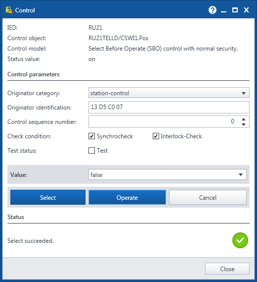 Переходим в узел CSWI1, вызываем окно управления, выставляем записываемое состояние в false, и нажимаем сначала кнопку Select: