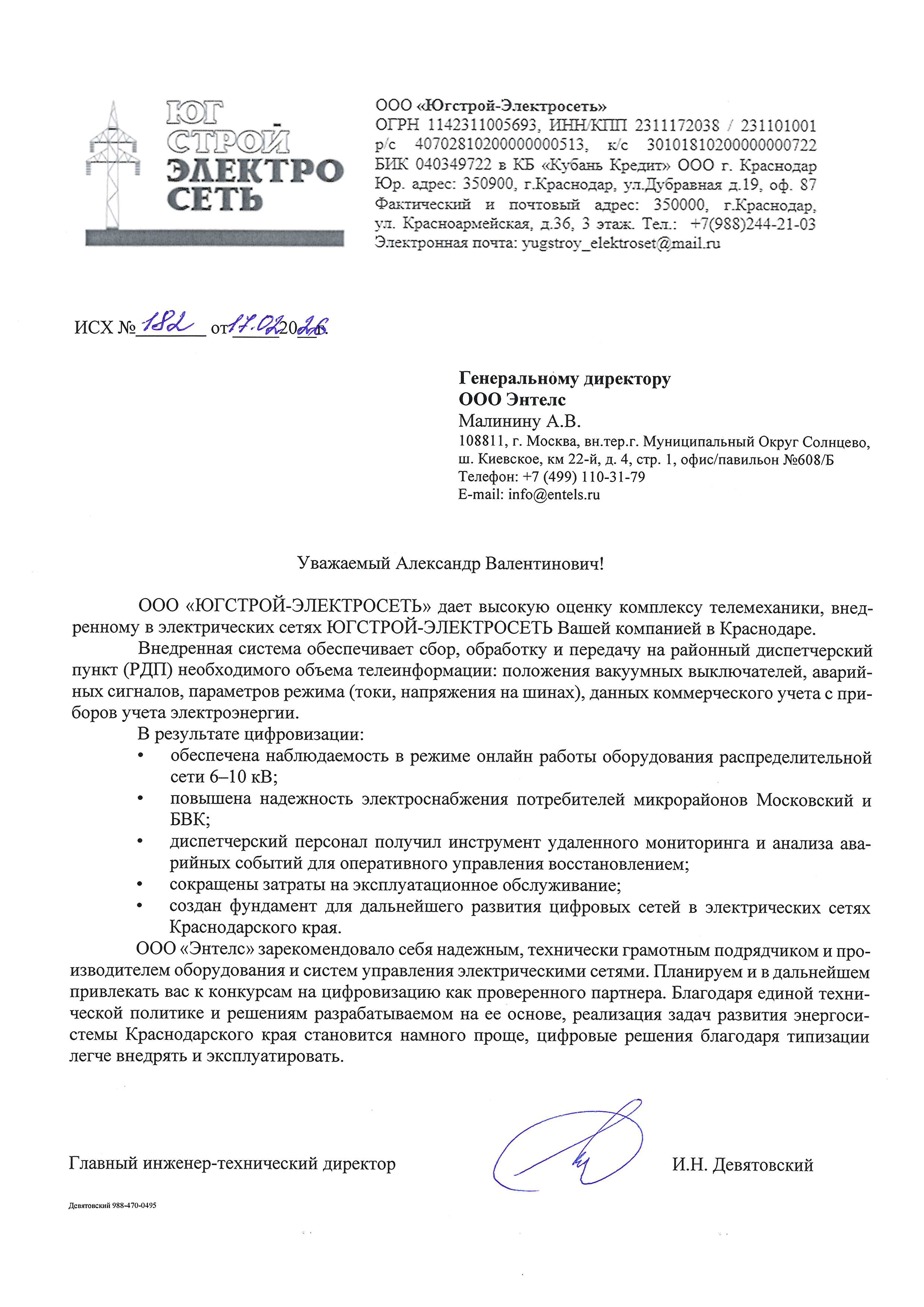 ООО «ЮГСТРОЙ-ЭЛЕКТРОСЕТЬ» даёт высокую оценку комплексу телемеханики, внедрённому в электрических сетях ЮГСТРОЙ-ЭЛЕКТРОСЕТЬ Вашей компанией в Краснодаре.