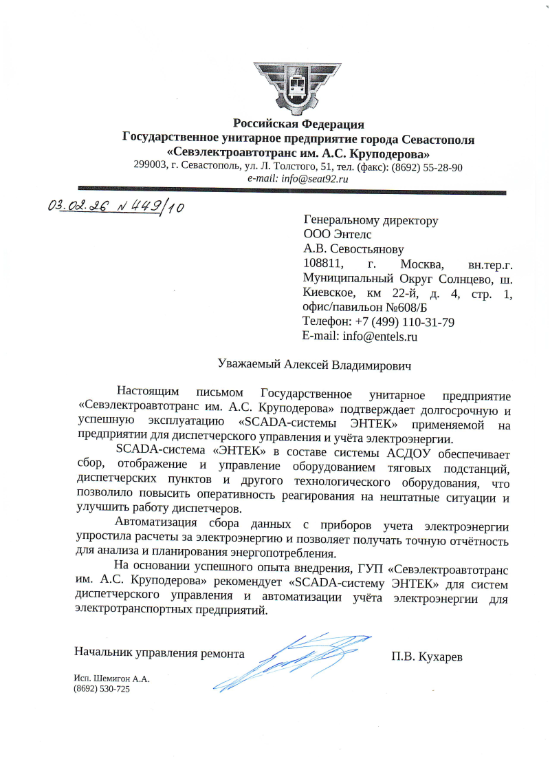 Настоящим письмом Государственное унитарное предприятие «Севэлектроавтотранс им. А.С. Круподерова» подтверждает долгосрочную и успешную эксплуатацию «SCADA-системы ЭНТЕК» применяемой на предприятии для диспетчерского управления и учёта электроэнергии.