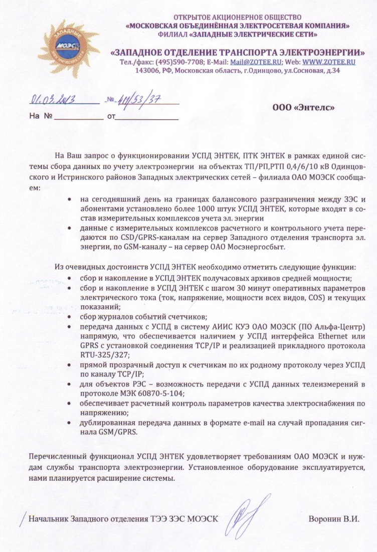 Рекомендательное письмо о применении УСПД ЭНТЕК в МОЭСК