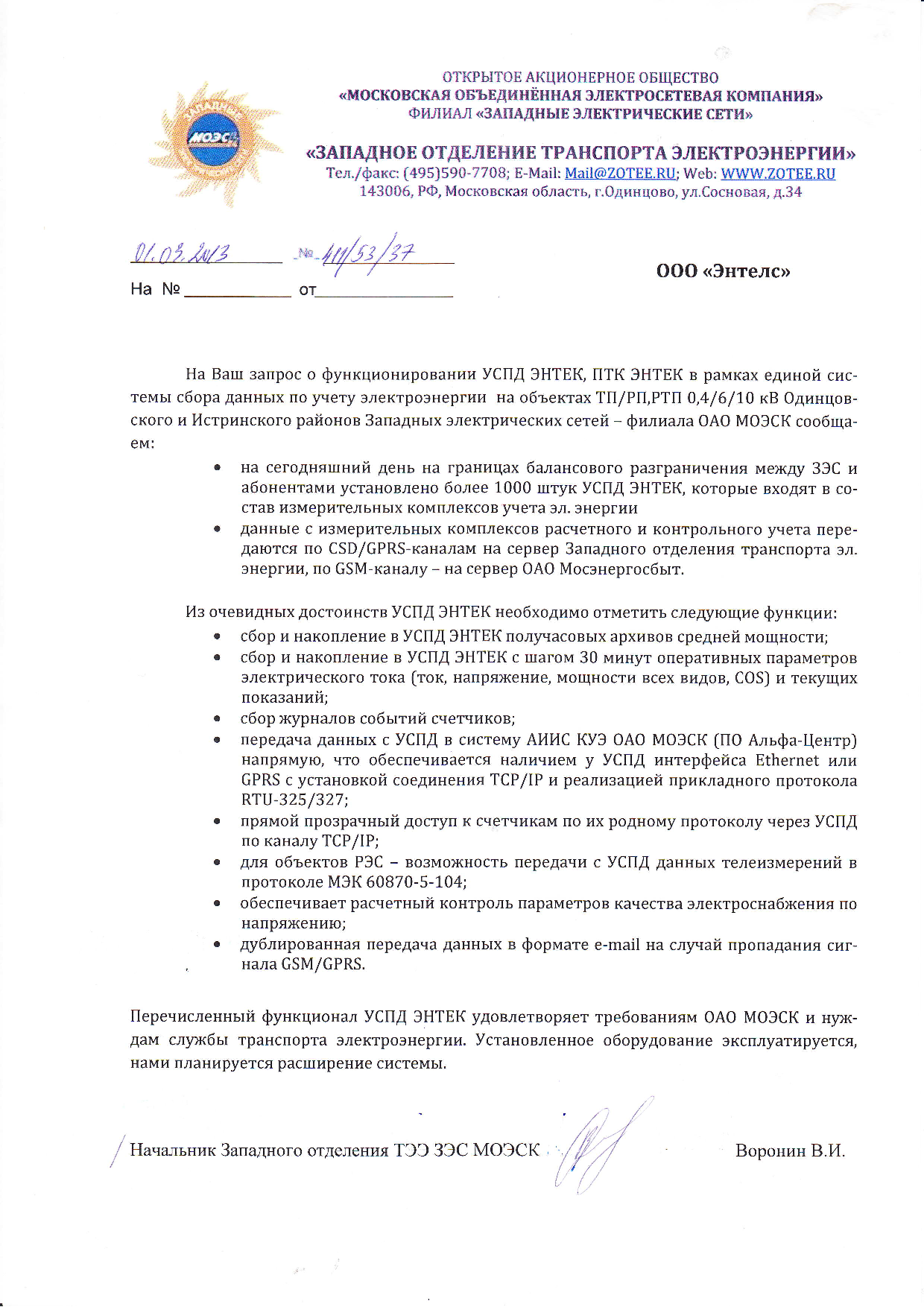 Рекомендательное письмо ЗЭС о функционировании ПТК Энтек
