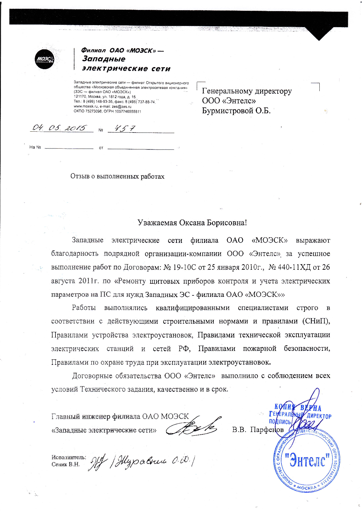 Рекомендательное письмо ЗЭС по Ремонту ЩП